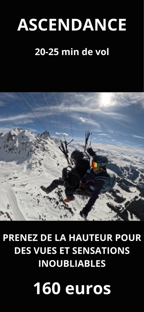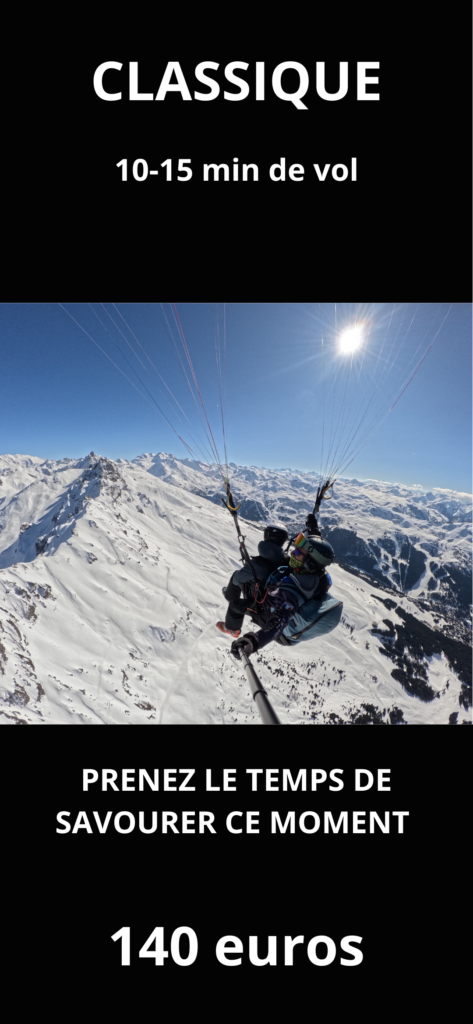 Accompagné par un pilote professionnel et expérimenté, vous survolez les sommets enneigés, les pistes mythiques et les paysages alpins spectaculaires, en toute sécurité. Que vous soyez skieur, piéton ou simplement en quête de sensations uniques, le parapente biplace est accessible à tous et ne nécessite aucune expérience préalable.